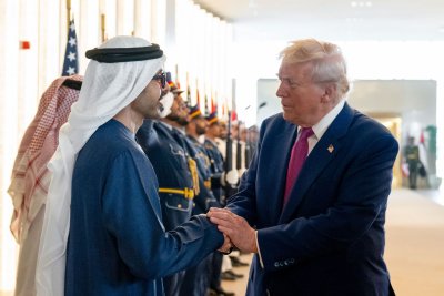 United Arab Emirates Deputy Prime Minister and Minister of Foreign Affairs Sheikh Abdullah bin Zayed Al Nahyan greets President Donald Trump in Abu Dhabi, United Arab Emirates, on Thursday. Photo by UAE Presidential Court/EPA-EFE