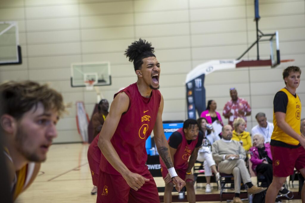 USC’s Chad Baker-Mazara, center, shouts from the sideline during a workout at the Galen Center.