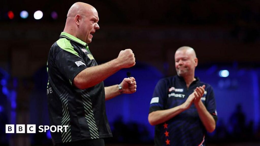Michael van Gerwen is through to the second round of the World Matchplay despite a below-par display against Raymond van Barneveld.