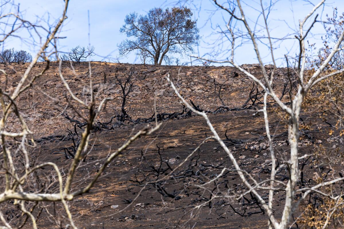 A burned hillside above the Getty Villa, where the Palisades fire burned around the educational center and art museum.