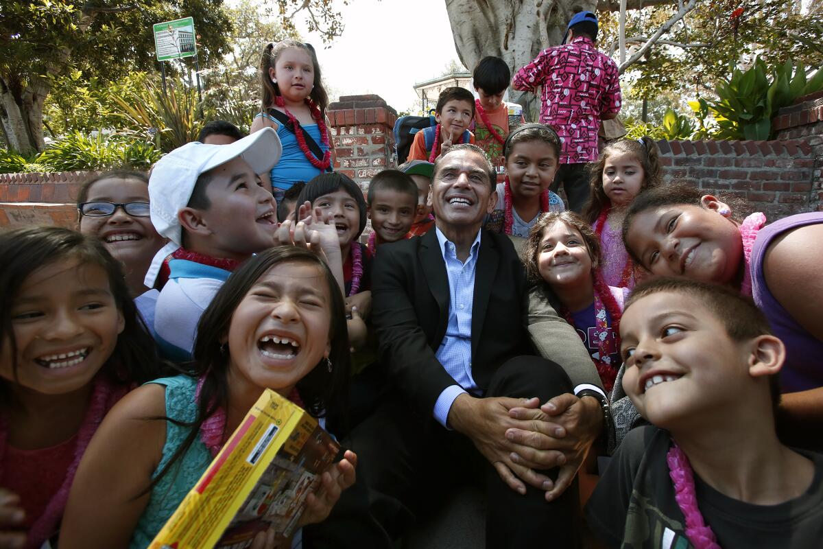 Antonio Villaraigosa gets his photo taken with students from Hazeltine Avenue Elementary School while visiting Placita Olvera in 2013.