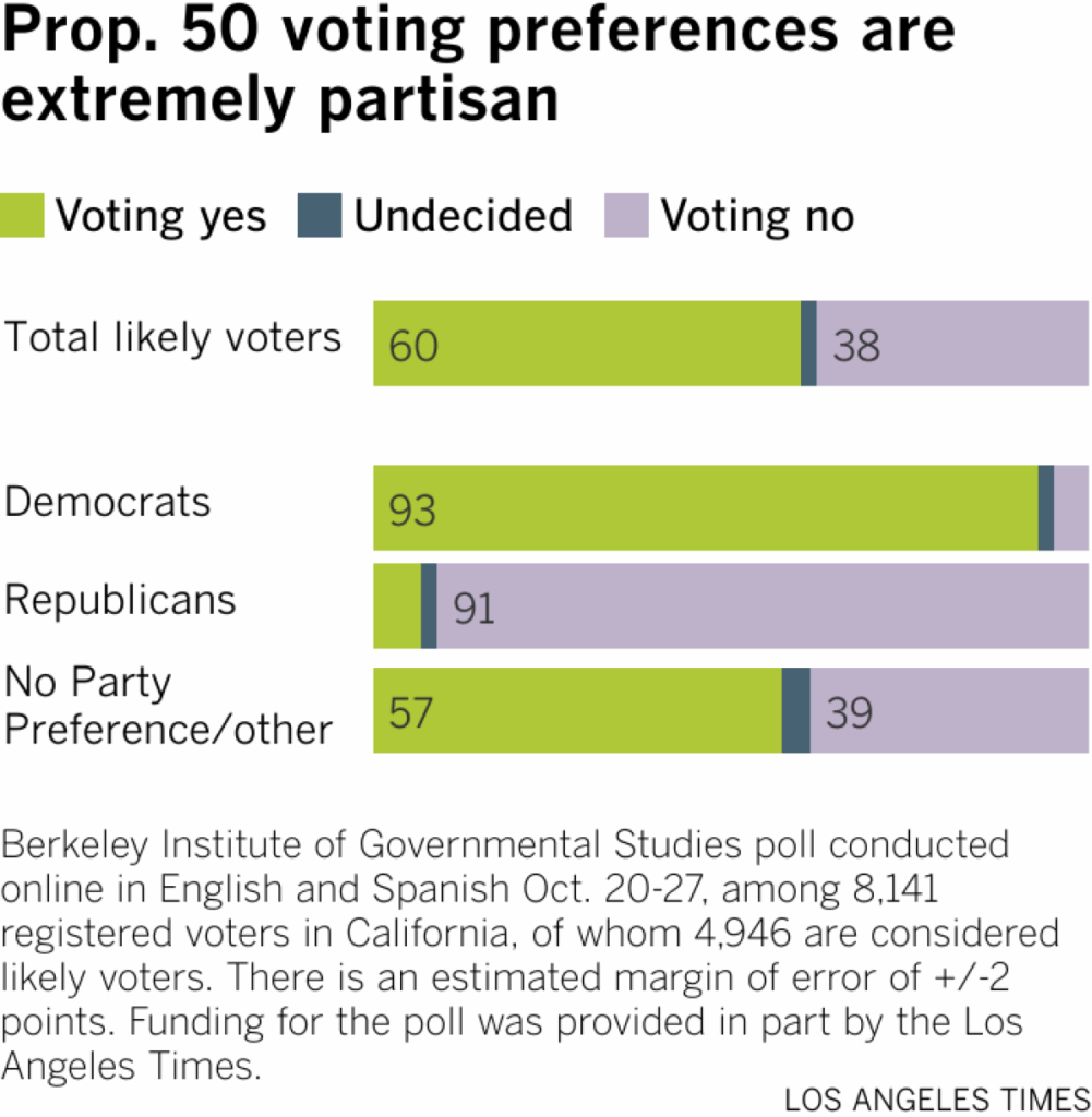 In the voter-rich urban areas of Los Angeles County and the San Francisco Bay area, Proposition 50 led by wide margins, the poll found. Voters in Orange County, the Inland Empire and the Central Valley were pretty evenly divided.