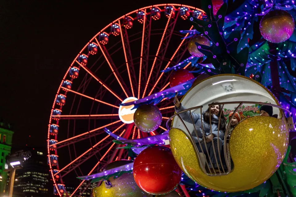 Children and adults on a Christmas-themed ride with a Ferris wheel in the background.
