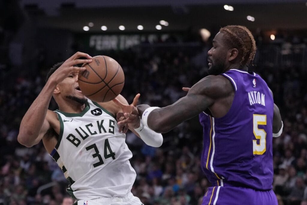 Laker Deandre Ayton fouls Bucks star Giannis Antetokounmpo on Saturday in Milwaukee.