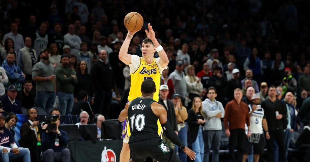 When one fan yelled “Who is No. 12?” early in the fourth quarter — after LaRavia hit a three-pointer to give the Lakers a 105-89 lead — it caught the attention of injured Minnesota star Anthony Edwards on the bench. Edwards responded by spreading his arms above his head and shouting “That’s what I’m saying! I don’t know!”