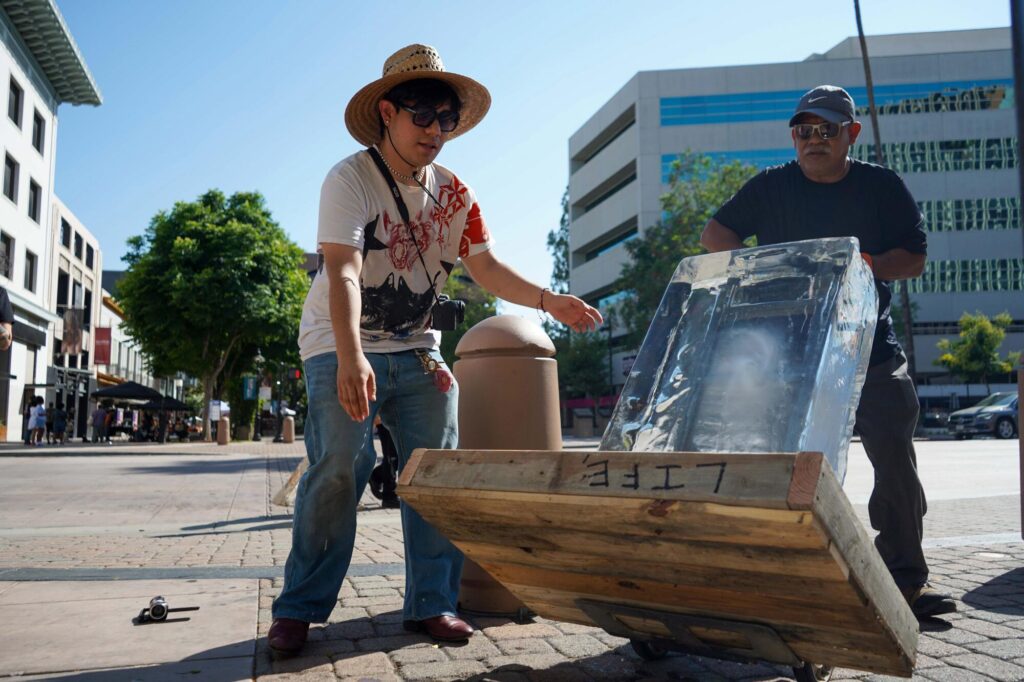 Perry Picasshoe and his father place an ice block near the epicenter of the city’s monthly arts walk in downtown Riverside on July 3, 2025.