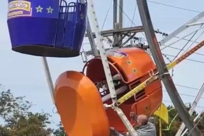 Another visitor, Eddie Jones, told WAFB: “We were in line to buy tickets to the Ferris wheel, and I heard a girl scream, and I looked over, and the Ferris wheel car was kicked over. I don’t know how it got in that position, but it was stuck. Yeah, I’ll probably never get on another Ferris wheel.”