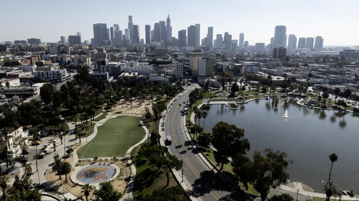Drone view of MacArthur Park looking toward downtown Los Angeles.