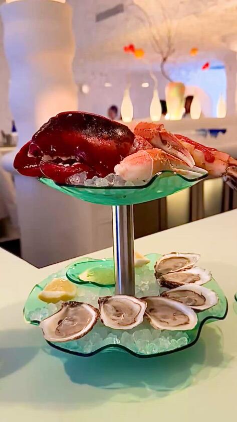 Seafood towers, served on undulating green-glass plates designed by Miradi, are stylish and modest in size and arrive as two levels for $83 or three levels for $97.