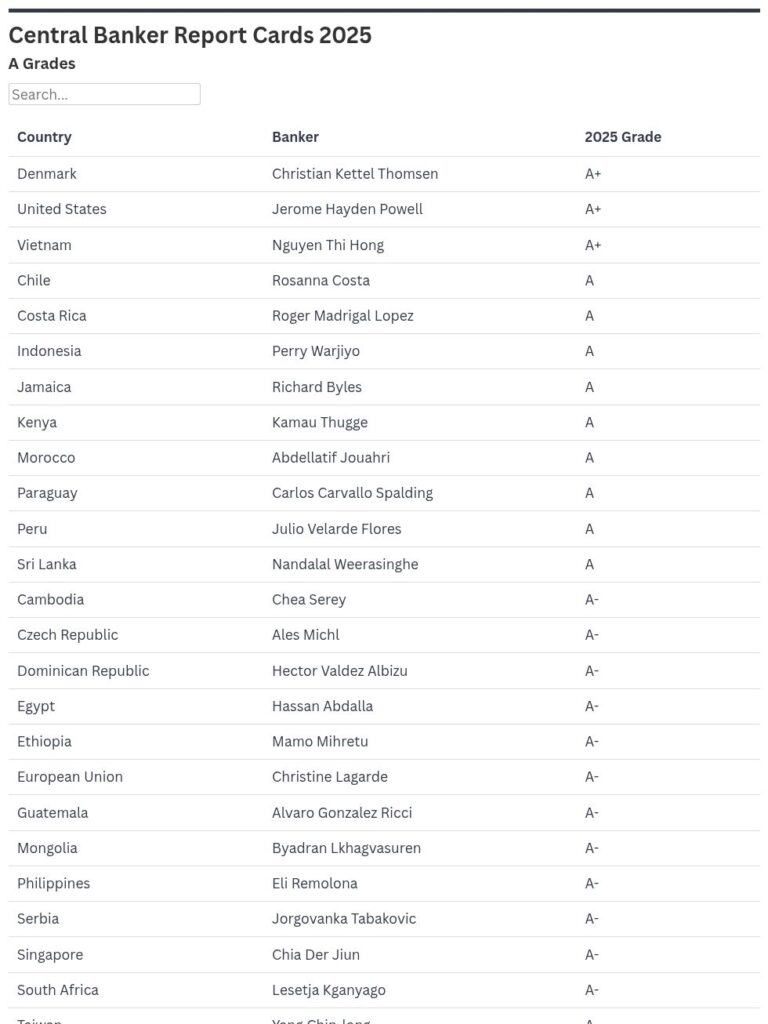 METHODOLOGY Global Finance editors, with input from financial industry sources, grade the world’s leading central bankers from A to F, with A+ being the highest grade and F the lowest, based on objective and subjective metrics. These judgments are based on performance from July 1, 2024, to June 30, 2025. A governor must have held office for at least a year to receive a letter grade. Central bankers in countries that are in deep conflicts are not included due to incomplete information. An algorithm supports consistency of grading across geographies. The proprietary formula factors in monetary policy, financial system supervision, asset-purchase and bond-sale programs, forecasting and guidance, transparency, political independence, and success in meeting the national mandate (which differs from country to country).