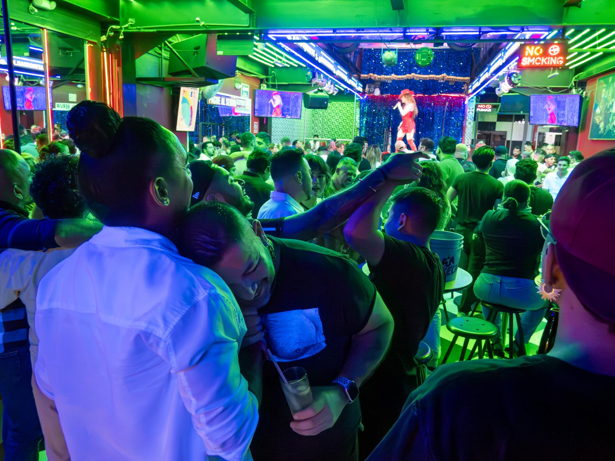 Negrete, holding a drink, embraces his friend Angel Martinez as they visit a drag club in Tijuana after leaving Los Angeles a day earlier.