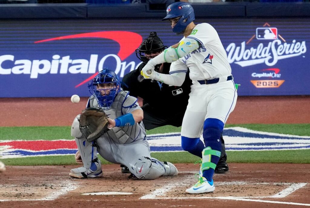 Toronto Blue Jays’ Bo Bichette hits a three-run home run during Game 7 of the World Series, Nov. 1, 2025, in Toronto.