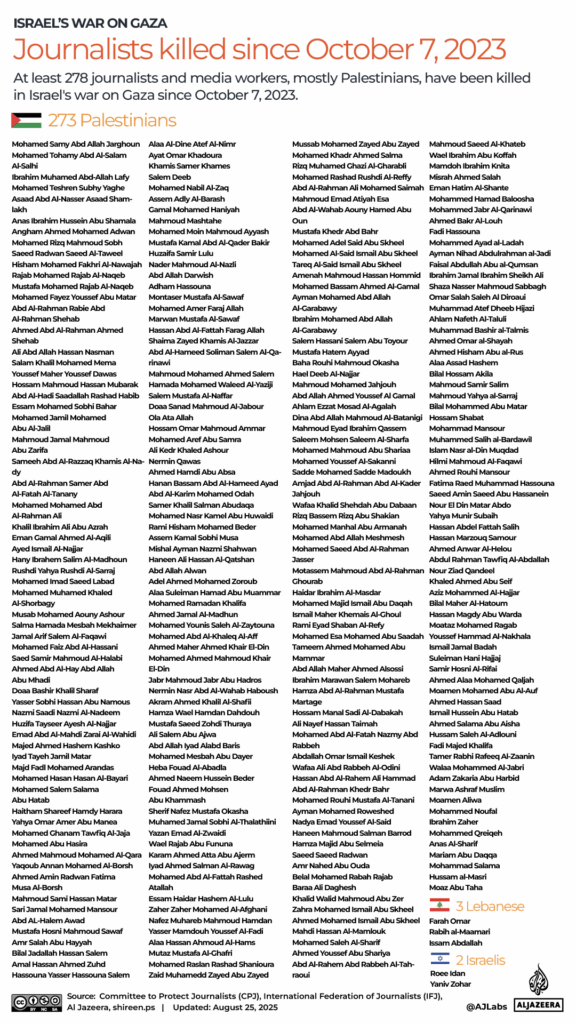 About 220 journalists have been killed during Israel’s war in Gaza since it began on October 7, 2023, according to RSF data. Independent analysis by Al Jazeera reveals that at least 278 journalists and media workers have been killed by Israel over the past 22 months, including 10 from the network.