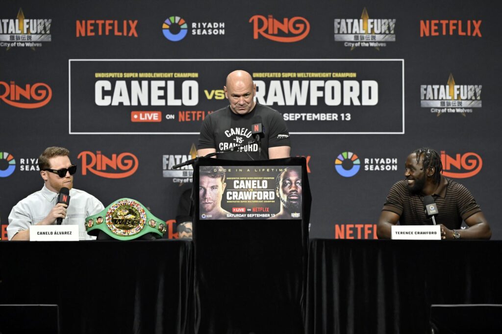 Canelo Álvarez, left; UFC CEO Dana White, center; and Terence Crawford, right, speak during a news conference at at T-Mobile Arena on June 27.