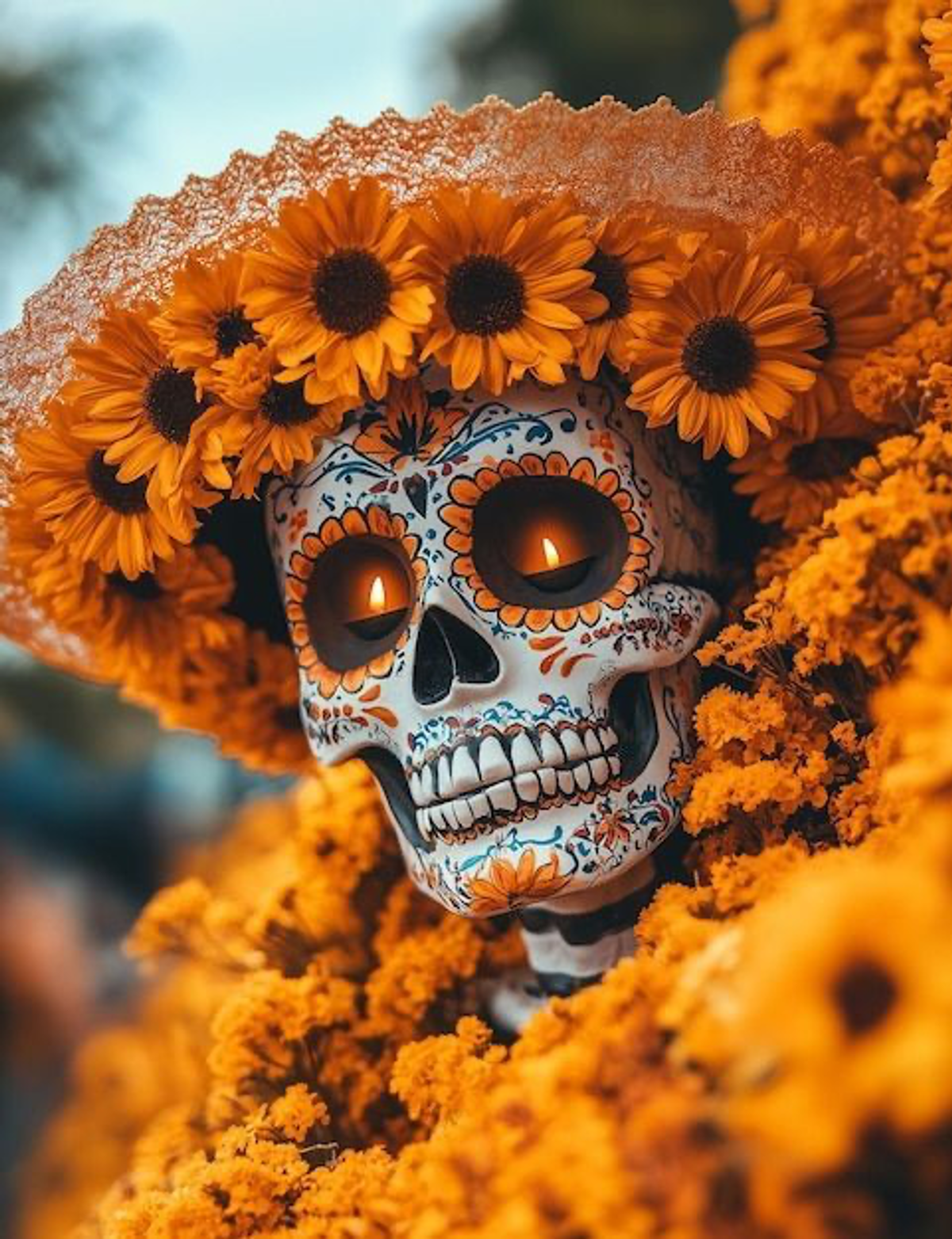20th-century printer and cartoonist José Guadalupe Posada’s La Calavera Catrina, Elegant Skull, was adapted into the holiday as one of the most recognizable icons.  It depicts a female skeleton adorned with makeup and dressed in fancy clothes.