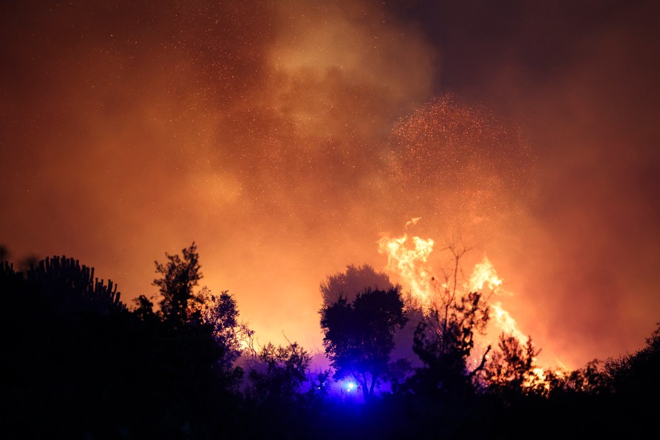 Residents try to contain a wildfire outside the town of Chios island in Greece, June 22, 2025. (Photo by Dimitris Tosidis / SOOC via AFP) (Photo by DIMITRIS TOSIDIS/SOOC/AFP via Getty Images)