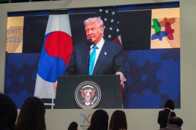 1 of 6 | U.S. President Donald Trump, seen on a screen at the APEC media press center in Gyeongju, arrived in South Korea on Wednesday. He said that a meeting with North Korean leader Kim Jong Un would not take place due to timing issues. Photo by Thomas Maresca/UPI